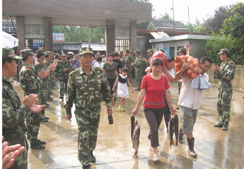 7月25日上午,焦岗湖农场男女老幼50余人在场领导带领下再次赶往增援焦岗湖防汛抗洪的武警安徽省总队临时驻地--鲁口镇中学,为他们送上500斤鱼、500斤肉和6大袋洋葱----再谱拥军崭新篇章。