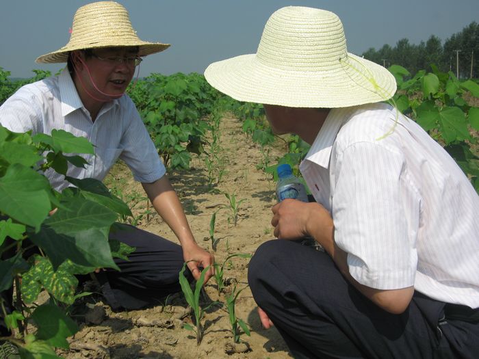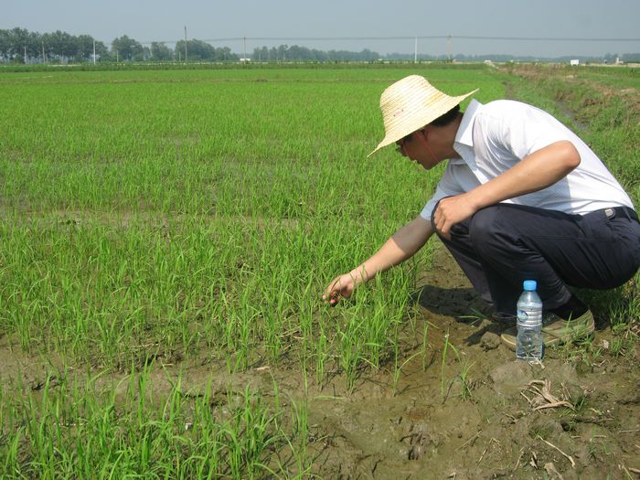 8月3日上午,皖河农场中联分场一农工正在补插的秧田里喷施农药,农场农业科科长钱学文带着2名农技人员在地头察看苗情,检查虫情,及时提出灾后生产管理和技术措施。