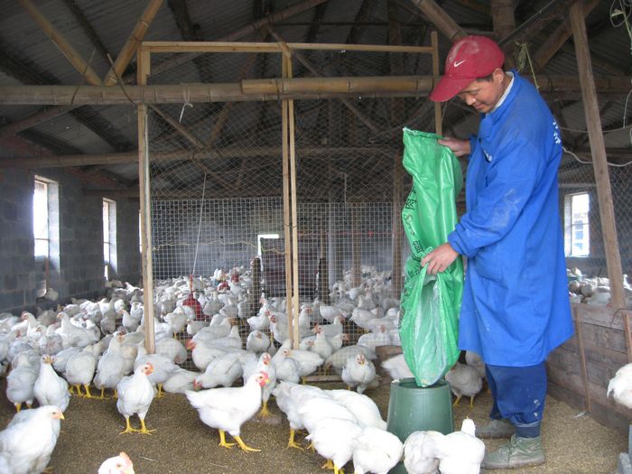 于是,去年下半年他开始另谋养鸡出路。他看中了位于红旗分场远离生活区的一片开阔地,花了4.5万元把别人使用过的简陋大棚鸡舍盘下来,又投入10万多元对1000平方米鸡舍进行改造,引进自动化饮水机,同时改善鸡舍采光、通风设施,并在鸡舍外面的空地上开辟了几座封闭式操场。第一批7000只公鸡全部是优质白三黄,而且是和安庆市永强禽业大市场签订的三包合同订单,对鸡苗、饲料和肉鸡出售价格全部“锁定”,他和妻子只在基地养鸡,不出家门,从鸡苗、饲料引进到技术指导和销售等其他一系列环节全由合作方“搞定”。