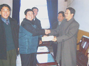 (图为:涂玉龙场长代表特困职工接受集团公司的 捐赠)