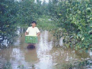8月29——30日,砀山果园场突遭特大暴雨袭击,受 灾 情况严重。图为职工在深水中采收酥梨、包 装果 品。(砀山果园场办公室)