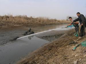 说明:苏义干沟(苏拐--义集)是淮河流域安徽段最 后一个行蓄洪区--潘村洼内纵贯南北的主渠,接收湖 区3个乡镇和一个农场5万余亩区域来水,对湖区农田 灌溉具有十分重要地位.从去年底开始,潘村湖农场 拨出资金16万元,调集大型吸浆机等设备对其进行清 淤疏浚,以提高灌区农田抗灾减灾能力.受到当地乡 镇粮农和农场职工的好评.图为吸浆设备正在实施清 淤作业的情景.(杨登宏摄)